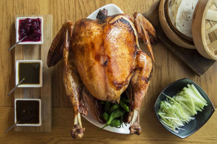 A whole Peking turkey dinner which feeds 6 to 8 people, sells for $495. The restaurant offers options for dining in from noon to 2 p.m. and takeout from 3 p.m. to 9 p.m. If you’re planning to order, or reserve, you’d better hurry. The birds go fast.